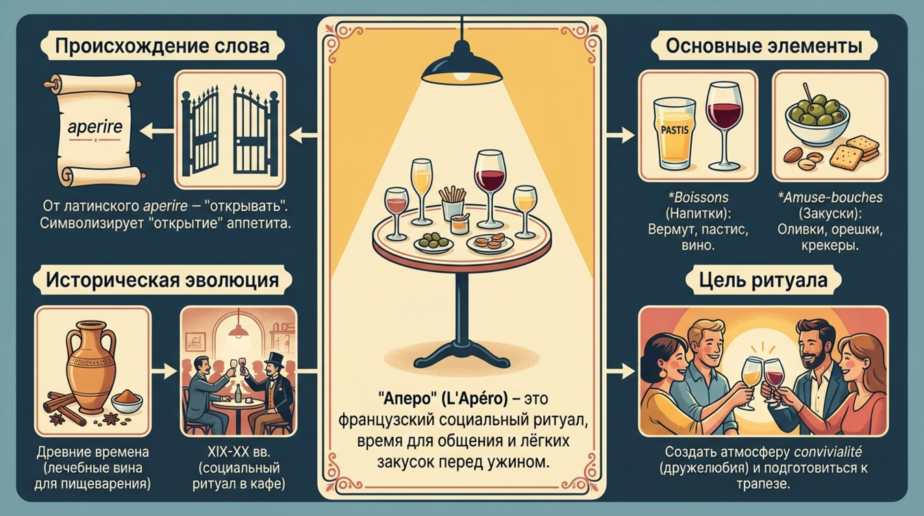 Начнём с основ. Само слово apéro (апéро) — это разговорное сокращение от apéritif (аперитúф). Если вас приглашают словами "On prend un apéro?" (Он пран ан апéро?) — "Выпьем по бокалу?" — это не столько вопрос, сколько предложение провести время вместе. Правильный ответ: "Avec plaisir!" (Авéк плезúр!) — "С удовольствием!"