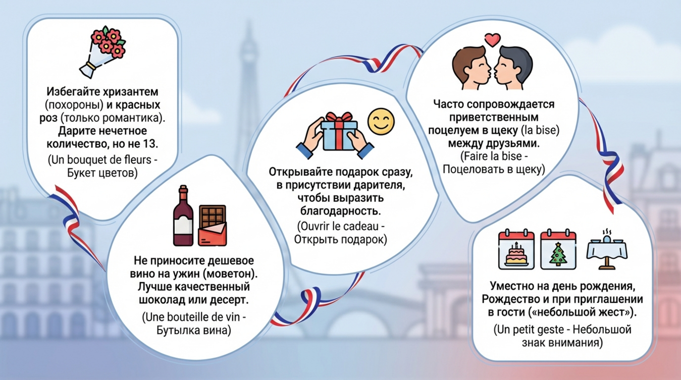 Процесс дарения и принятия подарков во Франции — это церемония, где важен каждый жест. Правильное поведение демонстрирует ваш «savoir-vivre» — умение жить в обществе с достоинством и грацией.