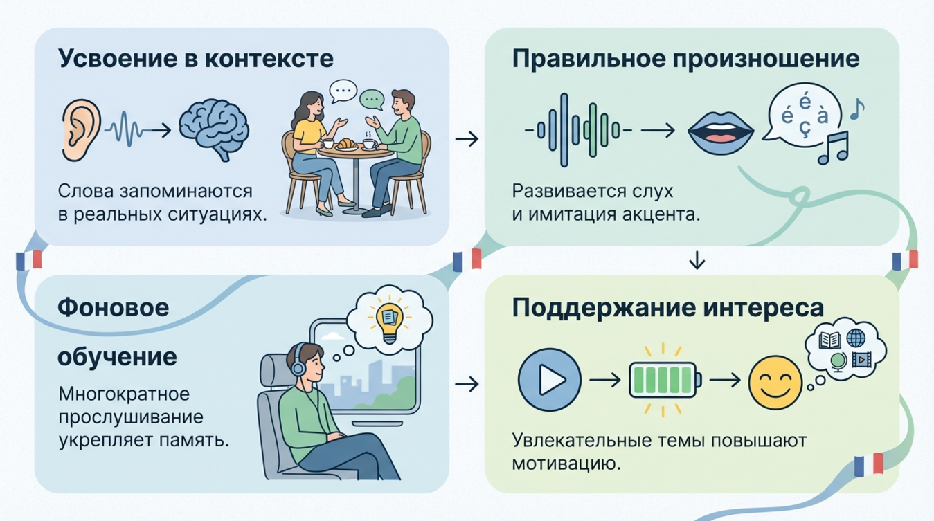 - Аудирование тренирует способность различать похожие звуки, что особенно важно для французского с его носовыми гласными