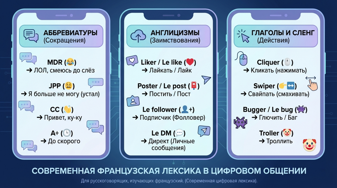 Молодые французы активно используют глагол «ghosting» (игнорирование без объяснений) и существительное «stalker» (тот, кто следит за профилями). По данным опроса Le Figaro (2024), 73% респондентов признались, что употребляют английские слова в французской переписке как минимум несколько раз в день. 🎯