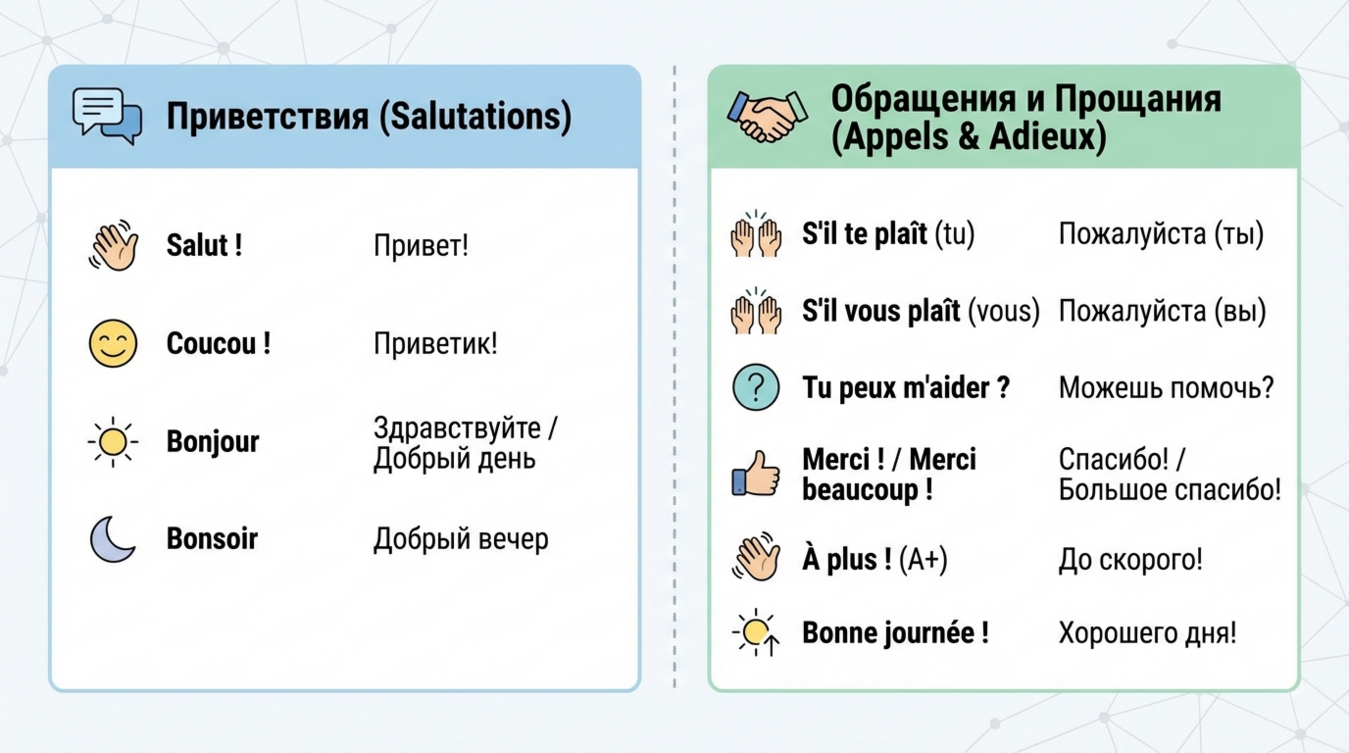 | Bonjour | Формальное/нейтральное | Первый контакт, деловое общение |