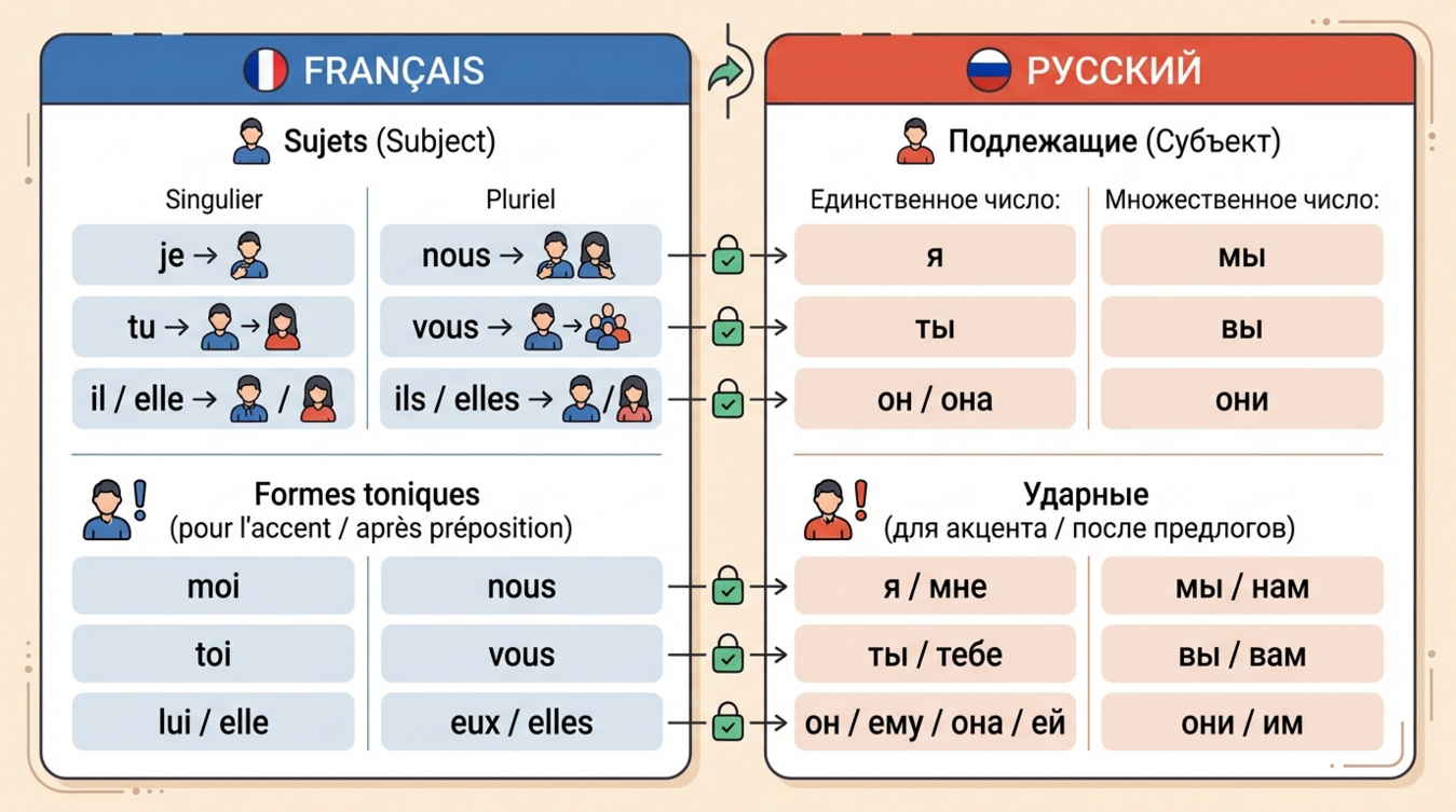 Французские местоимения гораздо разнообразнее русских. Они различаются по функции в предложении: одни выступают подлежащим, другие — дополнением. Кроме того, существует строгое разделение на ударные и безударные формы, что влияет на порядок слов и интонацию. По данным исследования Института французского языка (Institut de la langue française), местоимения составляют около 15% всех слов в устной французской речи — это огромная доля, игнорировать которую невозможно.