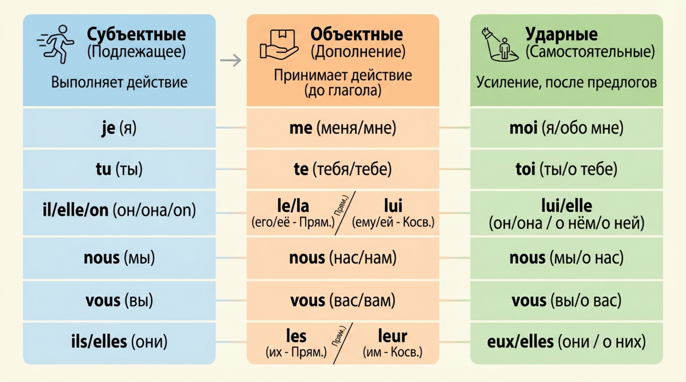 Личные местоимения — это первое, что должно встать на автомате. Они делятся на несколько категорий в зависимости от функции в предложении: подлежащие, ударные, прямые и косвенные дополнения. Каждая форма имеет своё строгое место и назначение.