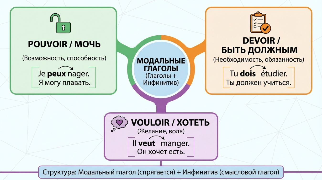 Модальные глаголы во французском языке — это особая категория глаголов, которые выражают отношение говорящего к действию: возможность, необходимость, желание или способность. В отличие от обычных глаголов, они редко используются самостоятельно и требуют после себя инфинитива другого глагола. Это фундаментальный механизм, без которого невозможно построить грамотную речь на уровне выше А1.