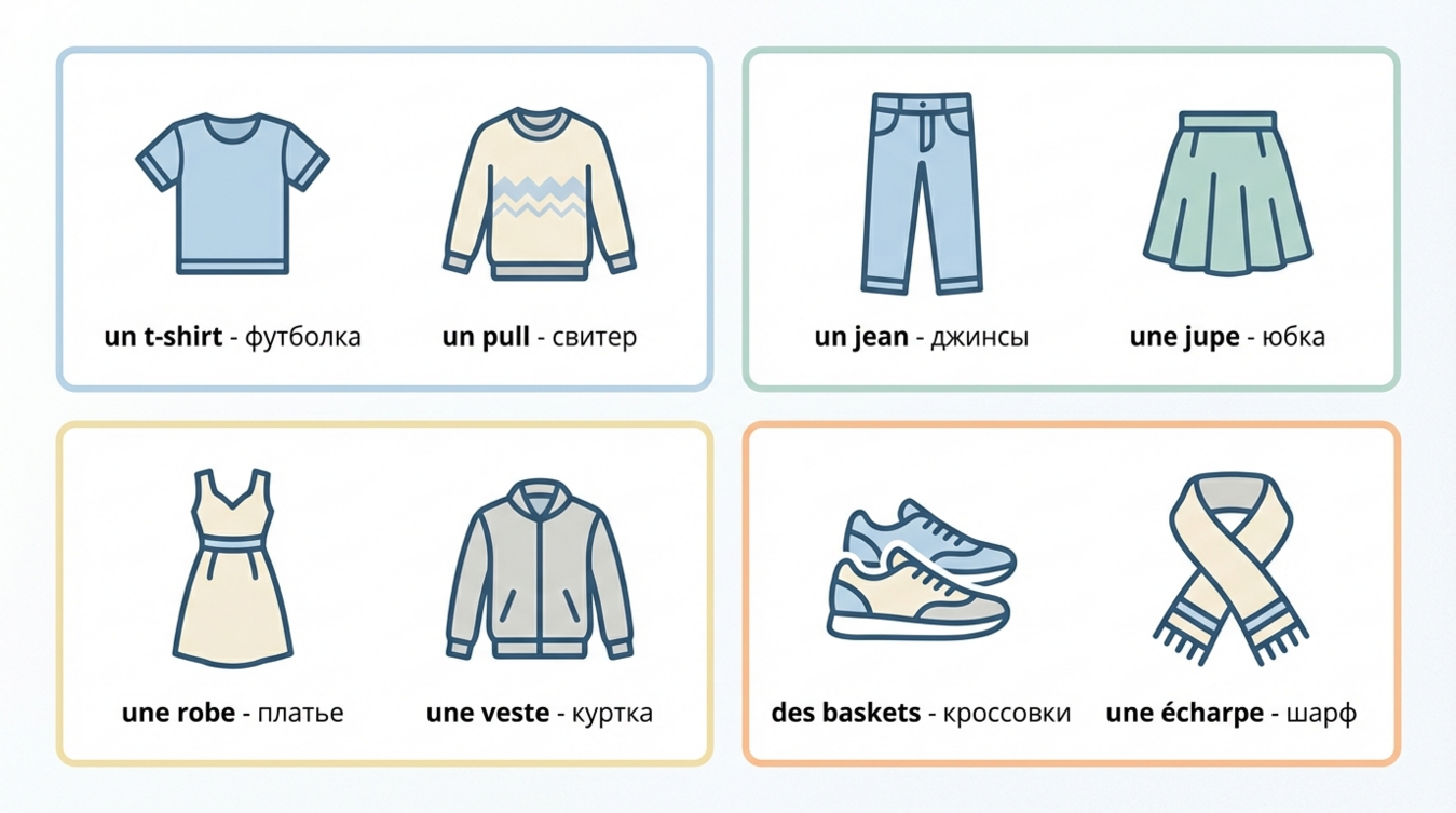 Освоение французской лексики гардероба начинается с базовых предметов одежды, которые вы носите ежедневно. Эти слова станут фундаментом вашего словарного запаса и позволят описать практически любой наряд.