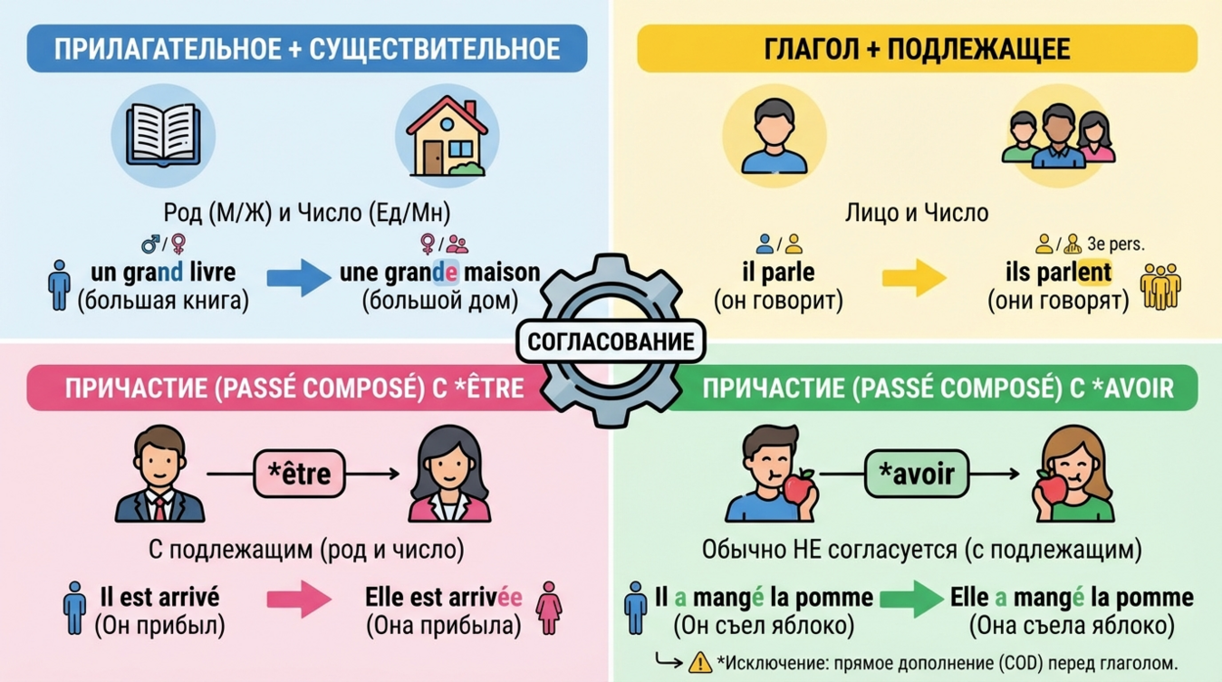 Согласование (l'accord) — фундаментальный принцип французской грамматики, требующий соответствия различных частей речи по роду и числу. В отличие от русского языка, где мы ориентируемся на падежи, французский синтаксис строится на жёстких правилах согласования между определяемым словом и его зависимыми элементами.