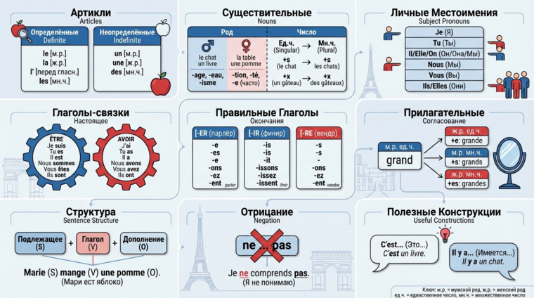 Французская грамматика строится на трёх китах: род существительных, артикли и строгий порядок слов в предложении. Если вы усвоите эти принципы в первую очередь, дальнейшее изучение пойдёт как по маслу 🎯