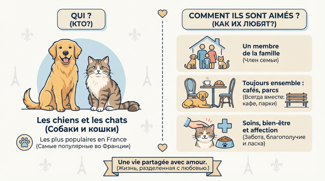 Французы традиционно предпочитают кошек — их популярность объясняется городским образом жизни и компактностью жилья. Кошка (un chat / une chatte) идеально вписывается в ритм парижской квартиры, не требуя ежедневных прогулок. Собаки (un chien / une chienne) занимают почётное второе место, причём французы отдают предпочтение небольшим породам: французские бульдоги, пудели, йоркширские терьеры.
