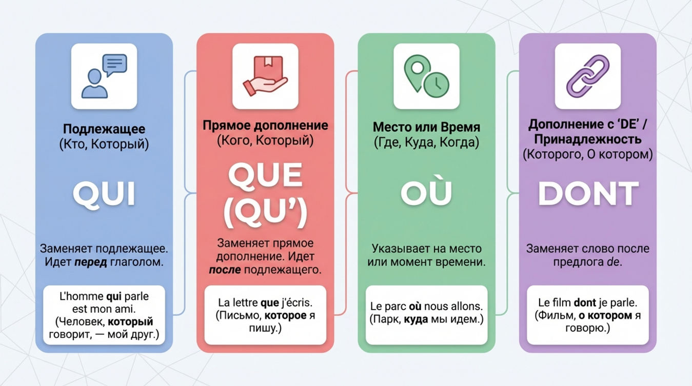 Грамматика французского языка строится на принципе экономии и точности. Вместо двух независимых предложений: "J'ai un ami. Cet ami habite à Paris" (У меня есть друг. Этот друг живет в Париже) — носитель языка использует относительное местоимение: "J'ai un ami qui habite à Paris" (У меня есть друг, который живет в Париже). Это не просто стилистическое предпочтение — это обязательное требование для речи выше базового уровня.