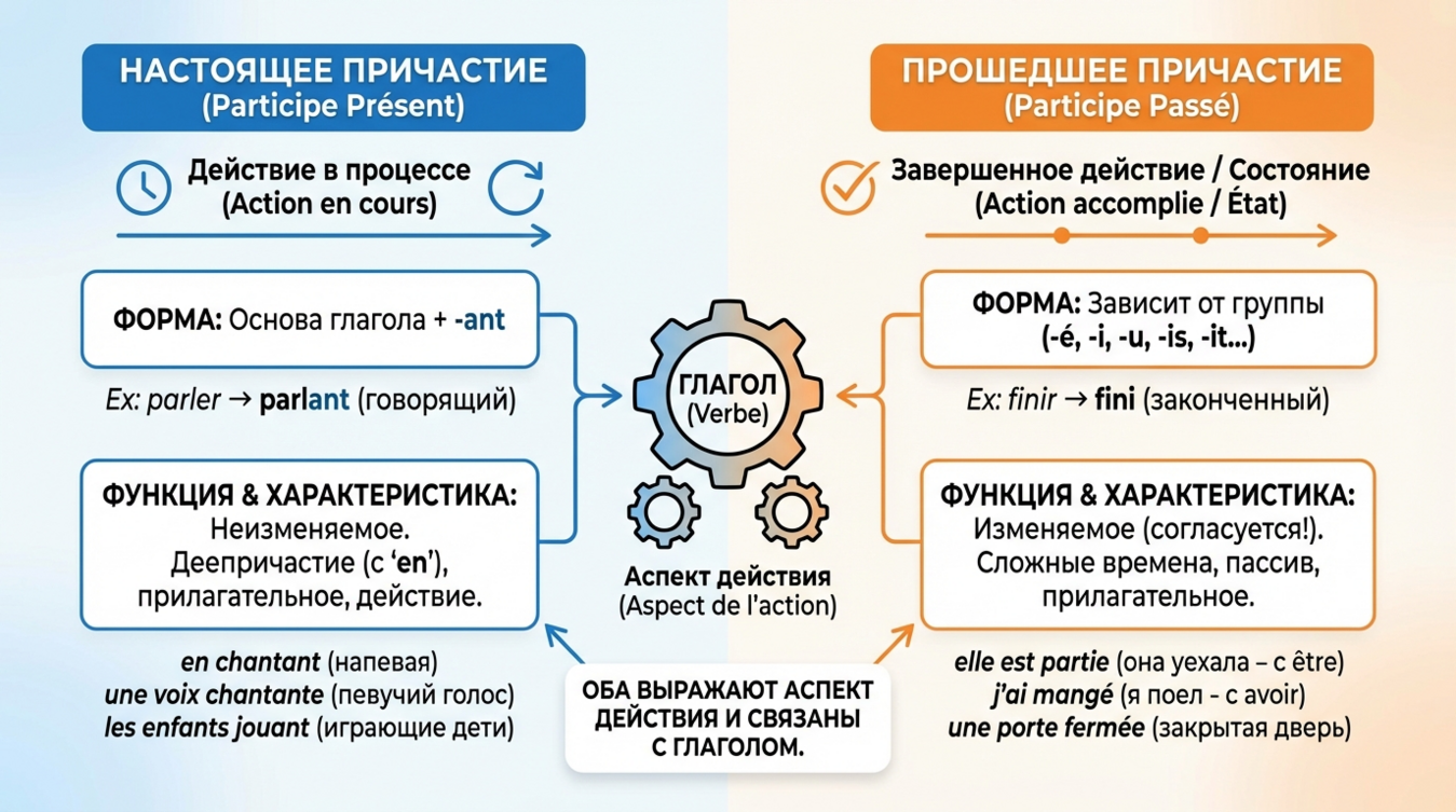 Причастия (les participes) во французском языке занимают промежуточное положение между глаголом и прилагательным. Они сохраняют глагольные характеристики — способность управлять дополнениями, выражать действие — но одновременно приобретают функции определения, описывая существительное или уточняя обстоятельства действия 📝