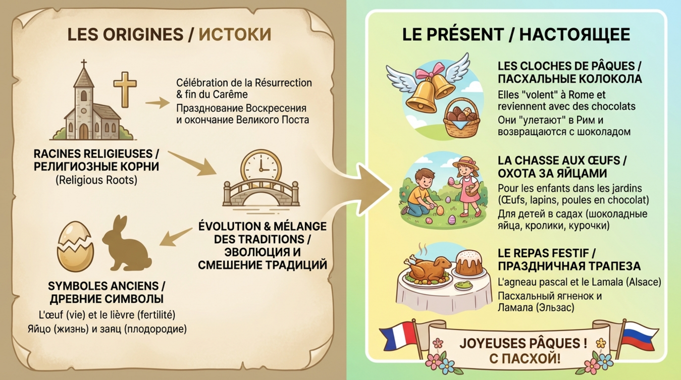 Французская пасхальная символика богата и многослойна, причём каждый символ несёт не только культурное, но и лингвистическое значение. Изучение этих символов помогает глубже понять французский язык и менталитет.