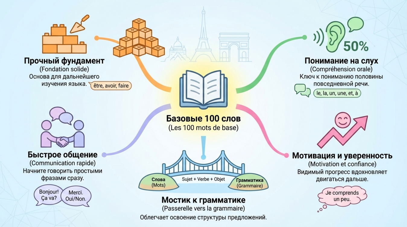 Французский язык открывает двери в мир изысканной культуры, но большинство начинающих совершают одну ошибку — пытаются охватить всё сразу. Грамматические конструкции, спряжения глаголов, фонетические нюансы — всё это важно, но не сейчас. Секрет быстрого старта прост: первые 100 слов дадут вам больше коммуникативной свободы, чем месяцы зубрёжки правил. Эти слова составляют костяк любого разговора, позволяют понимать 50% устной речи и строить базовые фразы уже через неделю практики. В этой статье вы получите структурированный список самых необходимых французских слов с переводом, примерами употребления и проверенными методами запоминания. 🎯