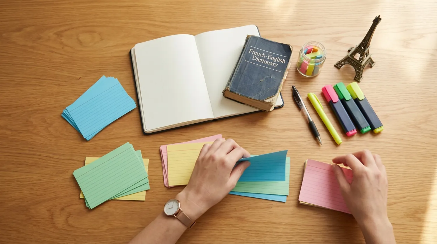 Создайте карточки со словами на одной стороне и переводом с картинкой на другой. Носите их с собой, повторяйте в транспорте, в очереди. Микросессии по 5-10 минут несколько раз в день эффективнее одного часа зубрёжки. Визуальный компонент (картинка) создаёт дополнительную ассоциацию.