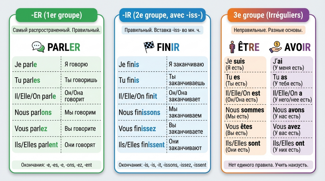 - Третья группа — все остальные глаголы, включая неправильные (être, avoir, aller, faire, prendre) 🔄