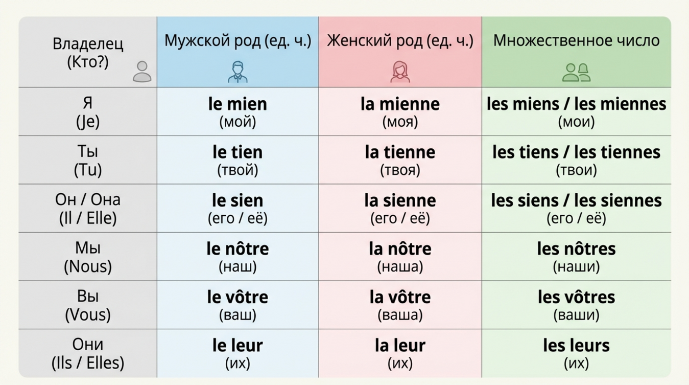 Система притяжательных местоимений во французском языке строится на пересечении двух параметров: лица владельца и характеристик объекта владения (род и число). Каждое лицо (я, ты, он/она, мы, вы, они) имеет свой набор форм, которые согласуются с тем предметом, о котором идёт речь.