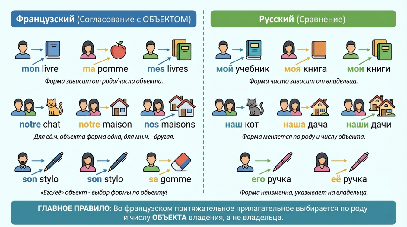 Важный нюанс: французские притяжательные формы согласуются не с владельцем (как в английском "his/her"), а с объектом владения. То есть son livre может означать и "его книга", и "её книга" — всё зависит от контекста, а форма son определяется тем, что livre — мужского рода.