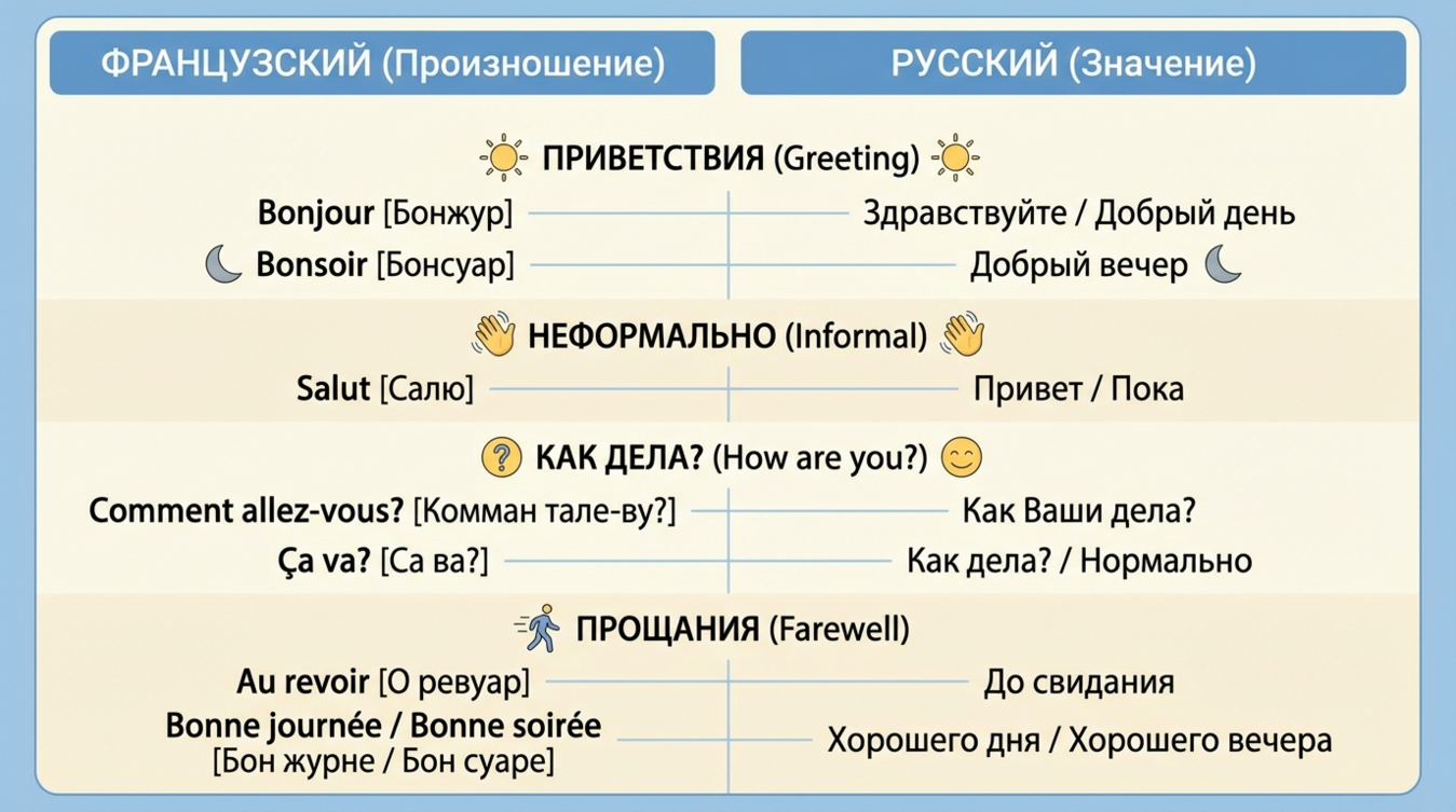 Очерёдность приветствий в группе — если вы входите в помещение, где несколько человек, нужно поздороваться с каждым по отдельности (если группа небольшая) или сказать общее «Bonjour à tous» (Здравствуйте всем). Проигнорировать кого-то — серьёзная оплошность. 🎯