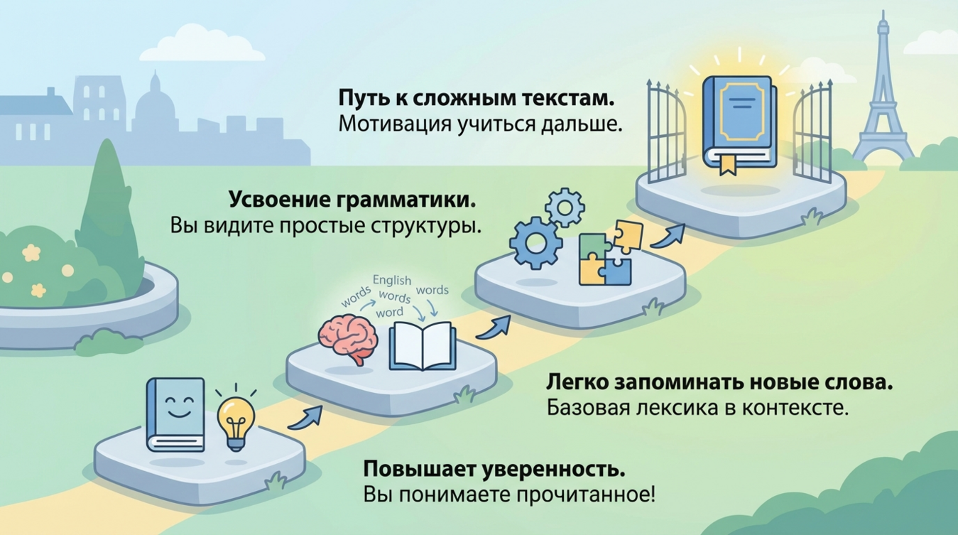 Вы мечтаете читать Дюма в оригинале, но замираете перед стеной незнакомых слов? Бросаете книгу после первого абзаца, потому что каждое второе слово приходится искать в словаре? Это знакомо каждому, кто изучает французский. Но есть секрет, который профессиональные лингвисты используют уже десятилетиями: начинать не с литературных шедевров, а с текстов, адаптированных под ваш уровень. Простые французские рассказы для начинающих — это не упрощение языка, а грамотно выстроенная лестница, по которой вы поднимаетесь от уровня A1 до свободного чтения. Забудьте о мучительной зубрёжке — чтение может и должно приносить удовольствие с первых же недель обучения 📚
