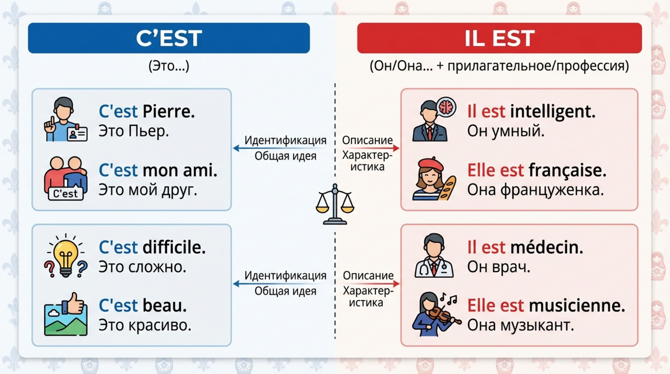 Важно понимать, что выбор между c'est и il est определяется не смыслом высказывания, а грамматической структурой предложения. Русскоговорящие часто пытаются искать логическую аналогию с родным языком, где оба варианта переводятся одинаково — "это есть" или просто "это". Однако французская грамматика требует строгого соблюдения синтаксических правил.