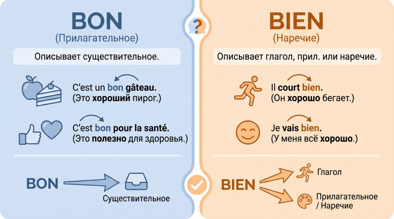 Главная ошибка изучающих французский — попытка переводить эти слова напрямую как "хороший" и "хорошо". Реальность сложнее: bon — это прилагательное (adjectif), которое описывает существительные, а bien — наречие (adverbe), характеризующее глаголы, прилагательные или другие наречия. Звучит просто? На практике различение требует понимания синтаксической роли слова в предложении.