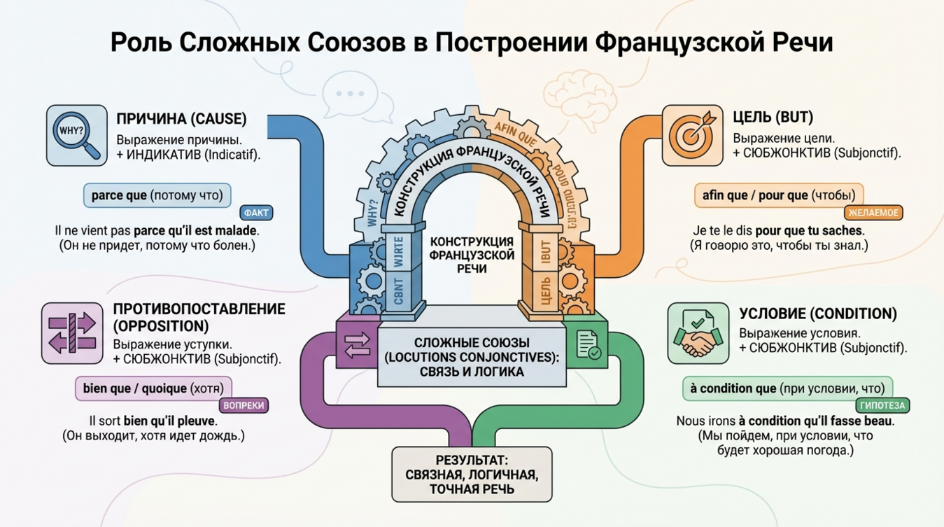 Сложные союзы образуют подчинительную связь между предложениями, создавая логические отношения уступки, противопоставления или условия. В отличие от простых союзов типа et или mais, они требуют более глубокого понимания грамматики французского языка и часто управляют наклонением глагола в придаточном предложении.