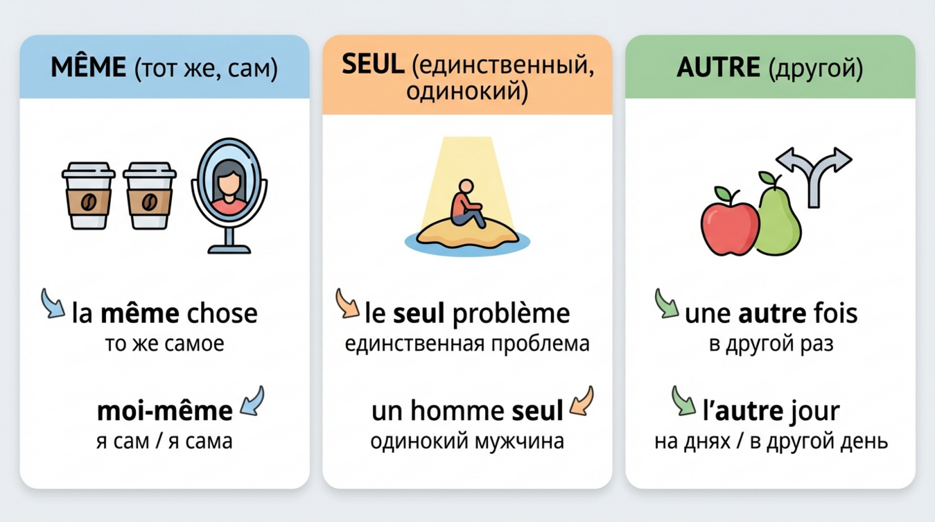 Освоение позиций и значений même, seul, autre требует системного подхода. Простого заучивания правил недостаточно — необходимо выработать языковую интуицию через практику и понимание логики.