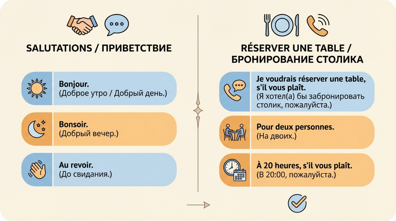 После приветствия переходите к бронированию или запросу столика. Вот ключевые фразы на французском: