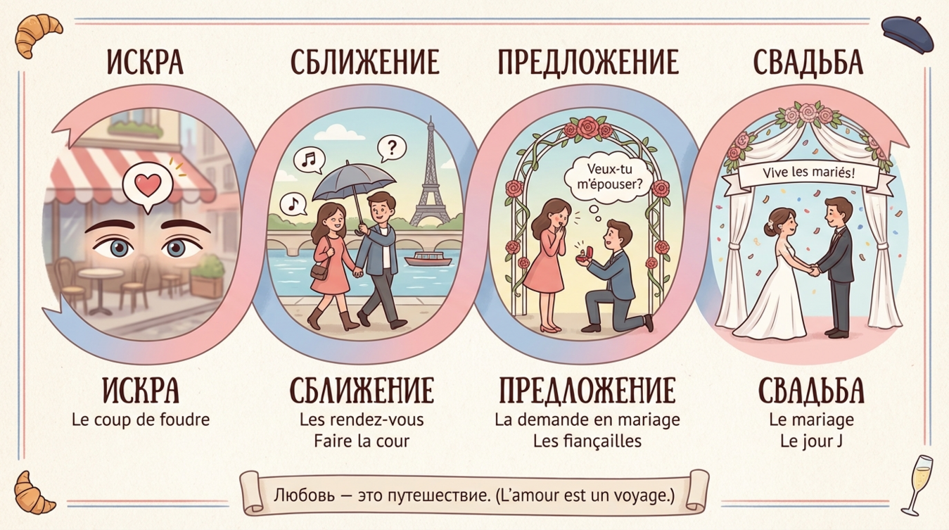 Французский язык — это не просто набор слов и грамматических конструкций. Это шифр, открывающий доступ к особой культуре чувств, где каждое выражение нежности несёт многовековой отпечаток романтической традиции. Многие изучающие язык сталкиваются с неловкой ситуацией: вы знаете, как заказать круассан или купить билет на поезд, но когда дело доходит до выражения симпатии, признания в любви или обсуждения серьёзных отношений — возникает вакуум. Романтическая лексика требует не только знания слов, но и понимания контекста, культурных кодов и эмоциональных оттенков. Сегодня разберём французский язык чувств от первого взгляда до свадебных клятв — с конкретными примерами, которые можно применять немедленно 💕