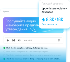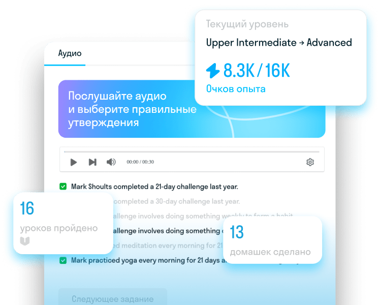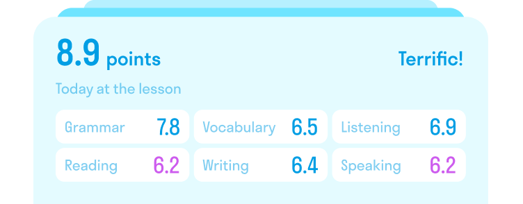 Вы платите за один курс, а получаете целую экосистему продуктов: занятия с преподавателем и лингвокоучем, тренажёры, разговорные клубы и чат-бот для устной практики